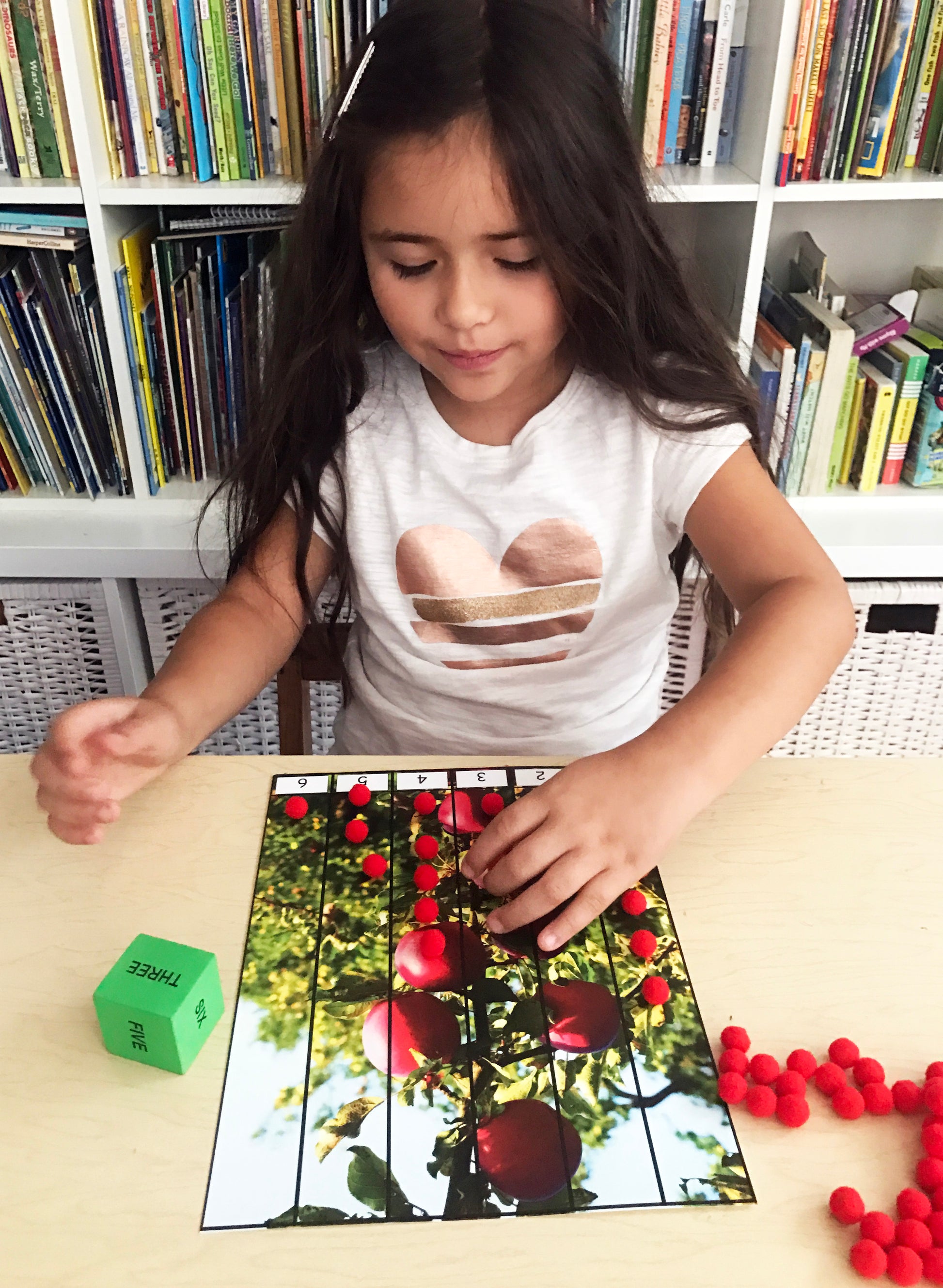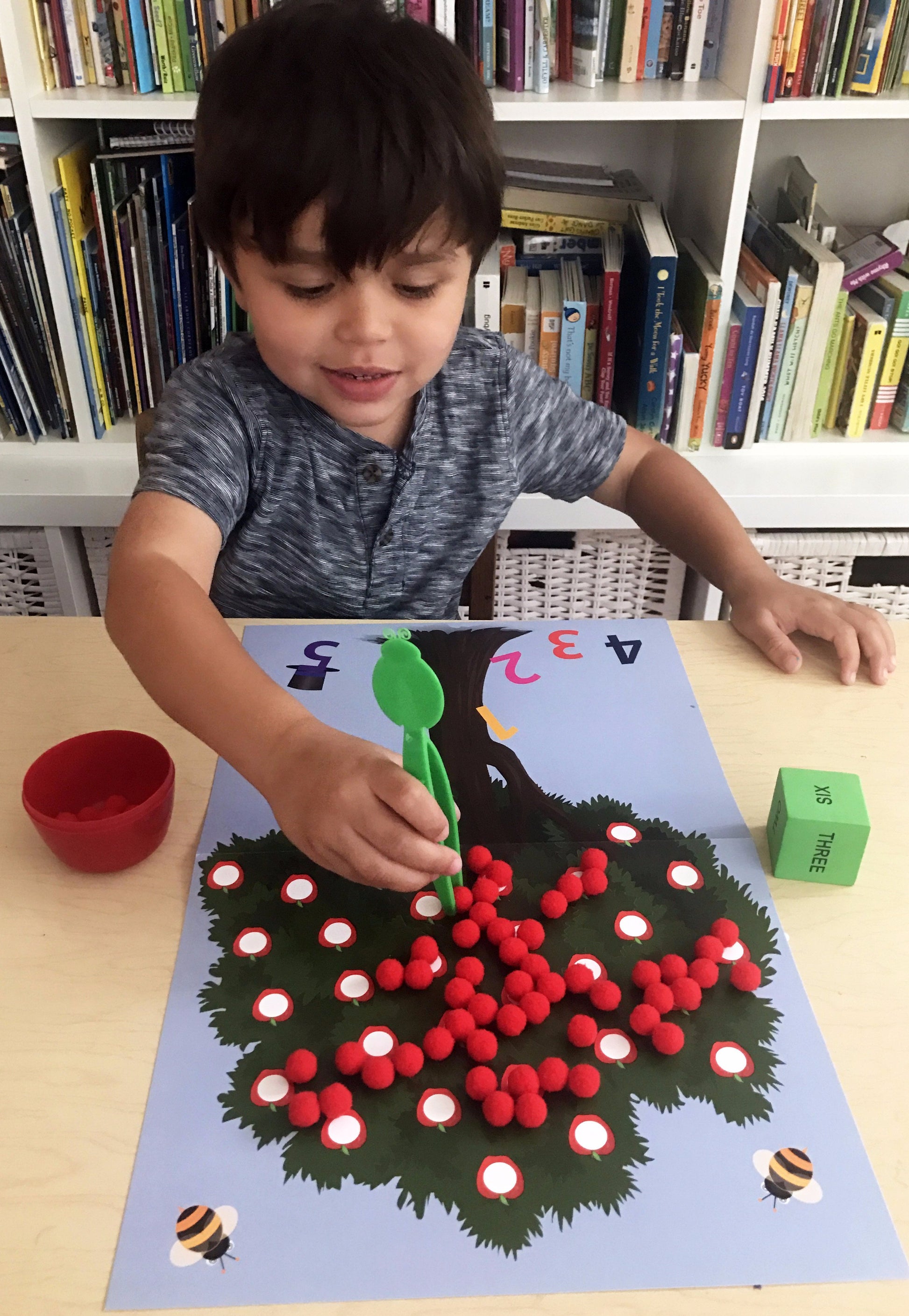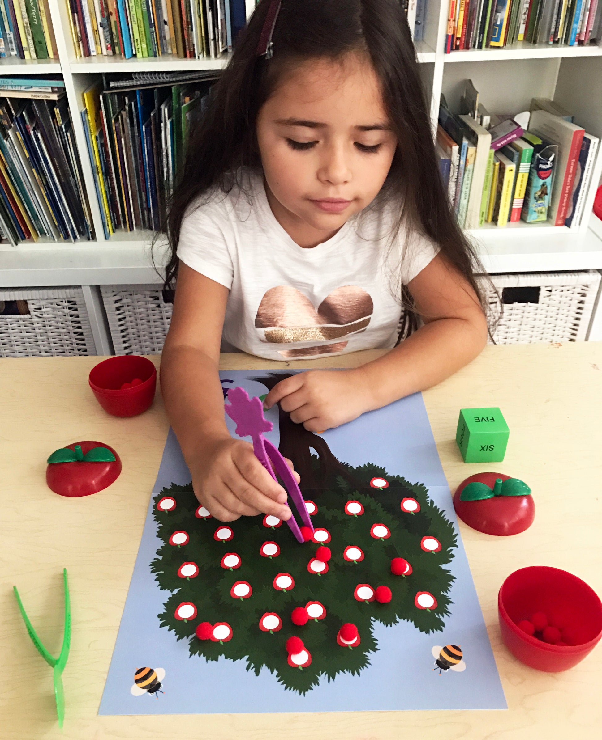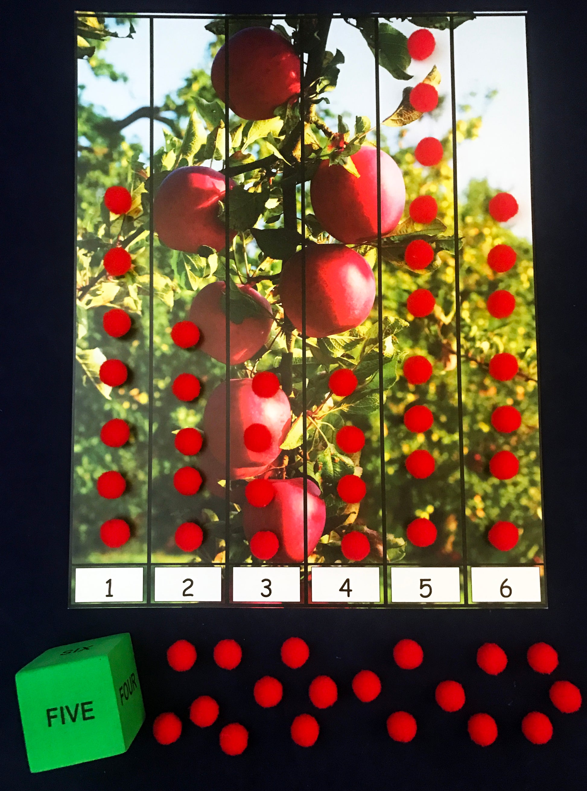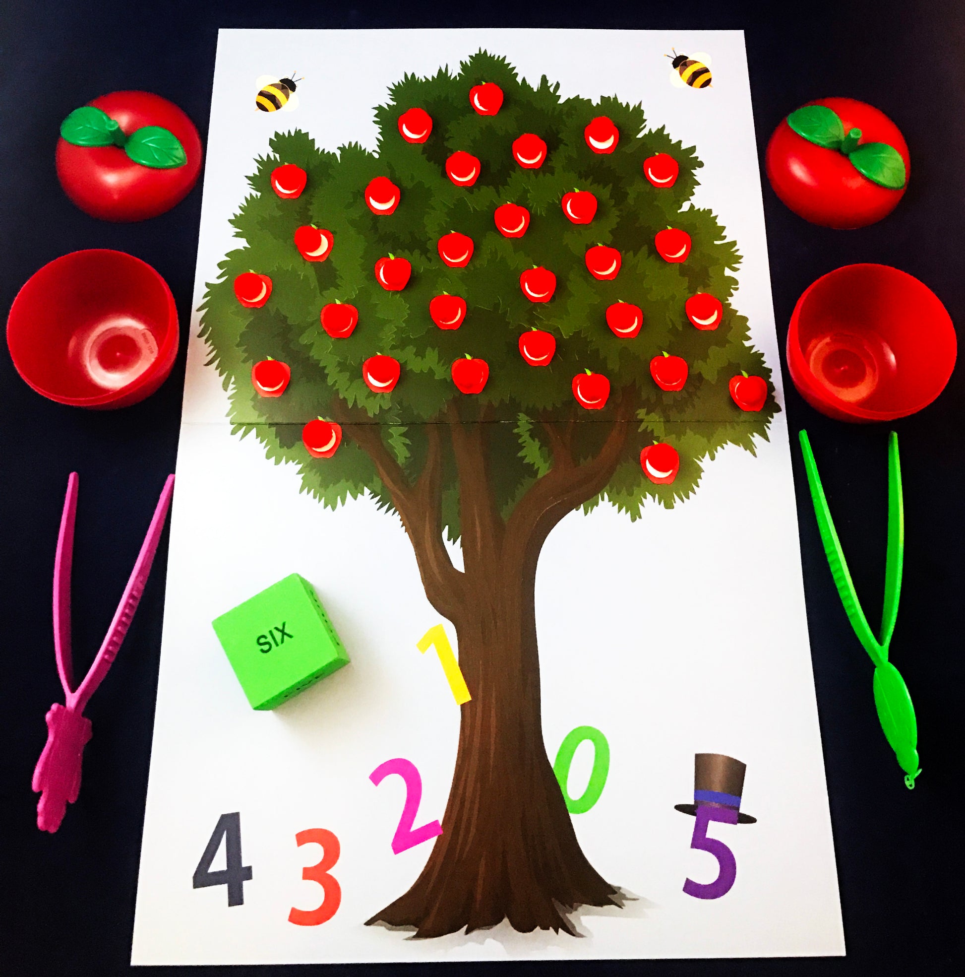 • Apple Picking: Players takes turns rolling the die and picking apples from the tree using tongs. Collect your apples in an apple container. How many apples will you pick?