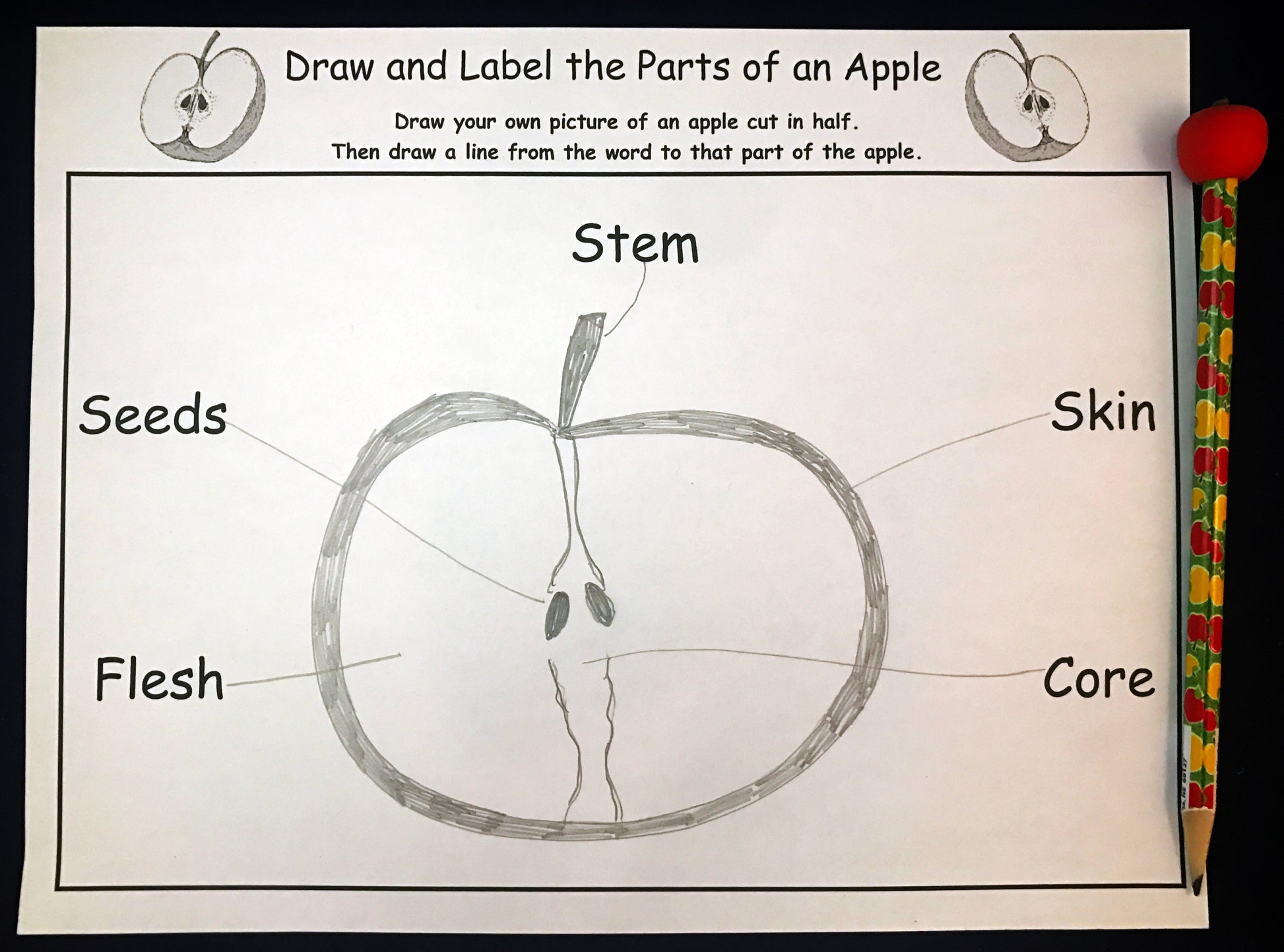 • Parts of an Apple: Use the apple information board and apple seeds to help you draw all the parts of an apple.