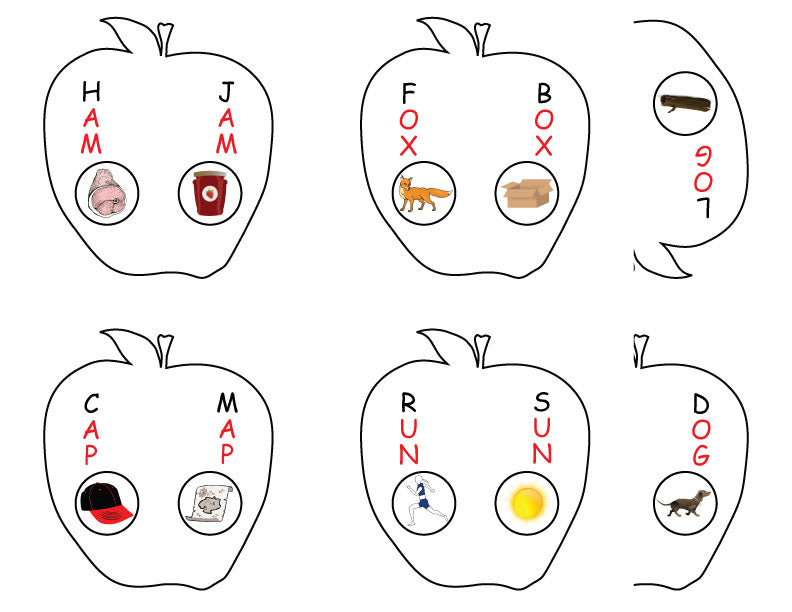 • Match the Apple Halves – Rhyming Game: Players flip over 2 cards at a time trying to find 2 apple halves that rhyme. 2 rhyming halves make a match. How many matches can you find?