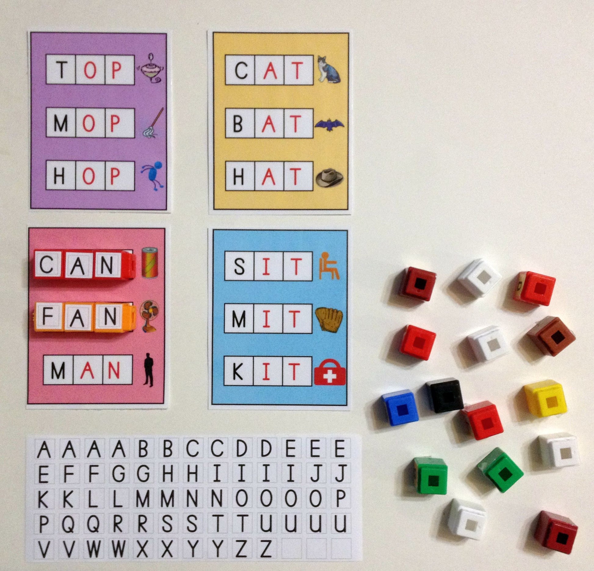- Word Family Cards: Place the alphabet stickers on the unifix cubes and connect the cubes to make rhyming words.
