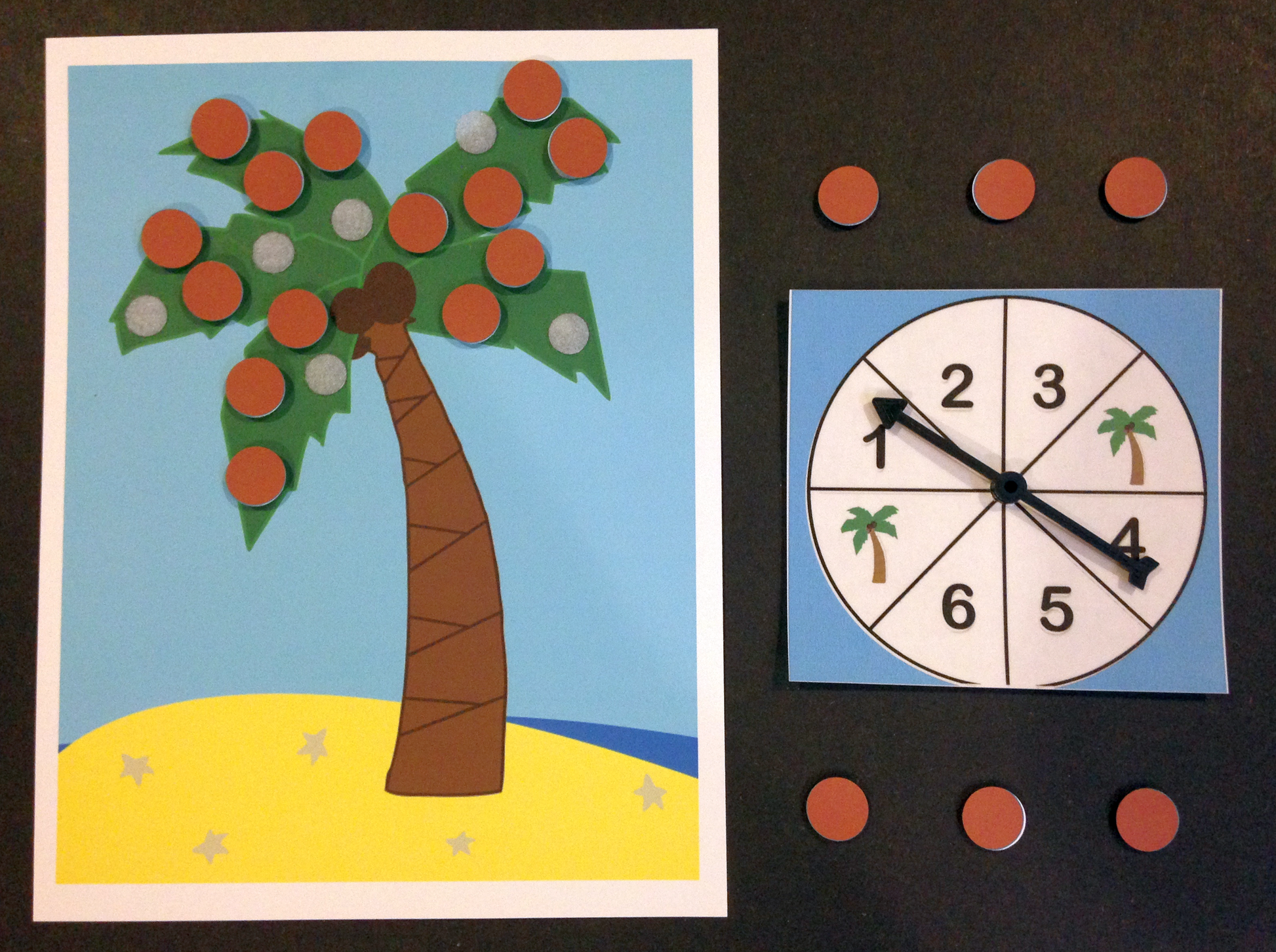 • Coconut Tree Math Game: Use the spinner to determine how many coconuts to collect from the tree.