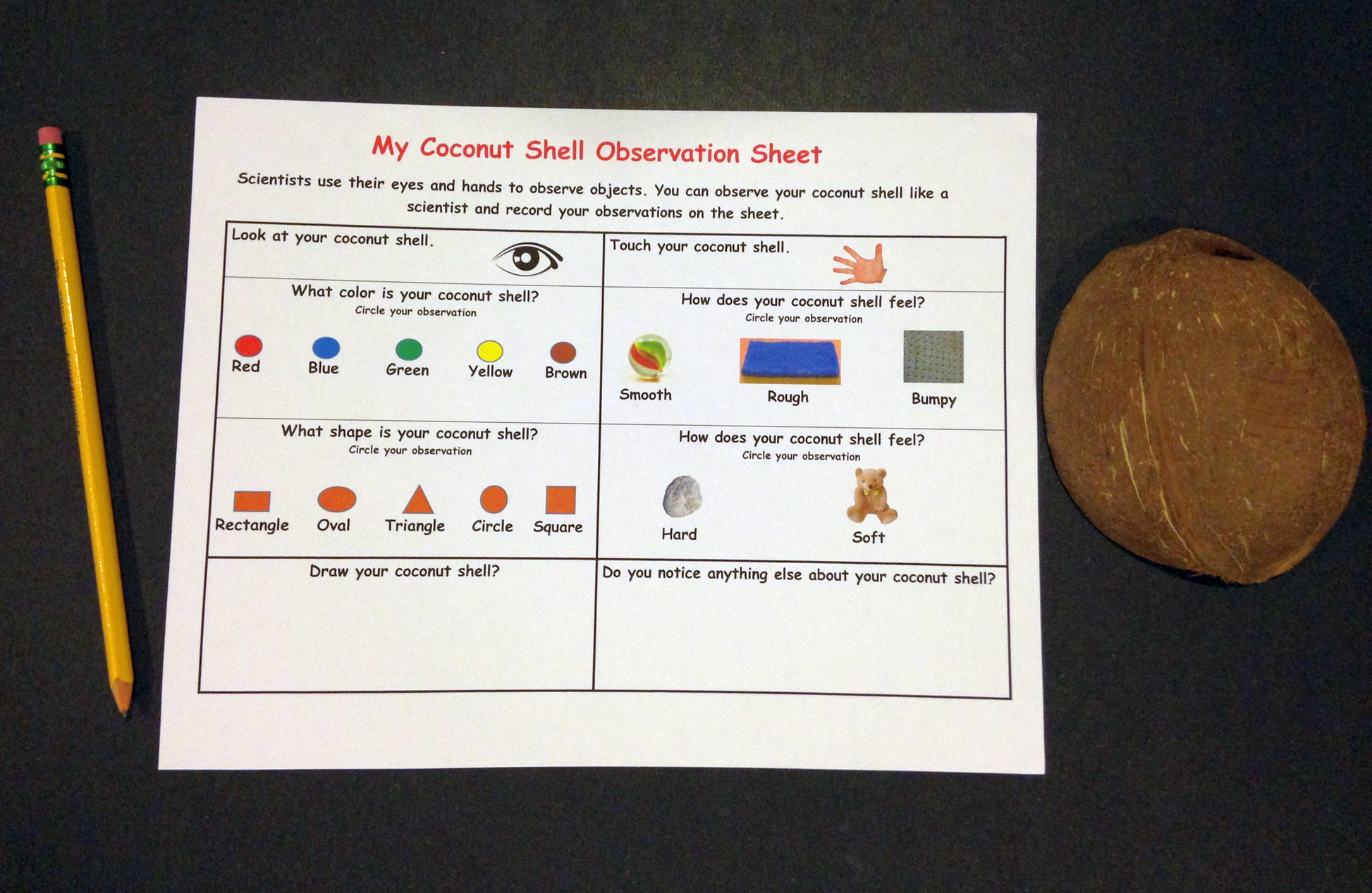 • Coconut Shell Observation: Use your eyes and hands to observe the coconut shell and record your findings.