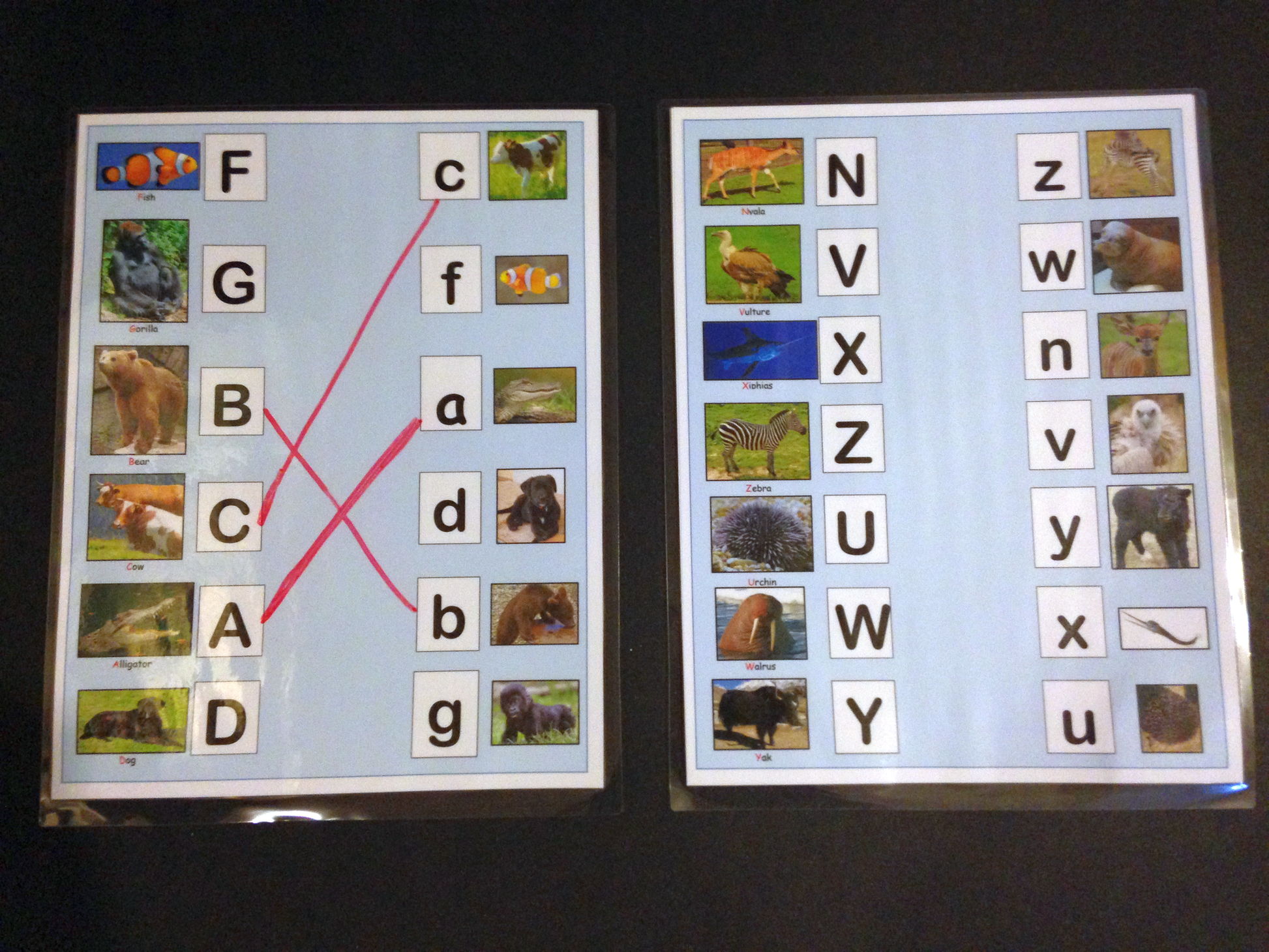 • ABC Animal Matching: Use the dry erase marker to match the uppercase letters to the lowercase letters, as well as, the adult animals to the baby animals.